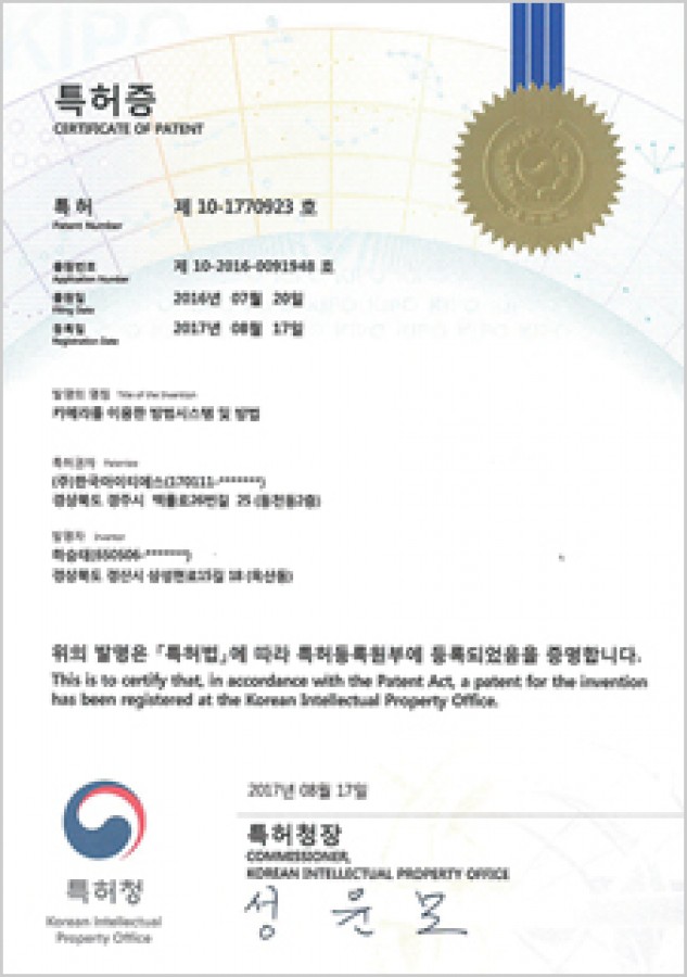 특허증 (카메라를 이용한 방법시스템 및 방법)