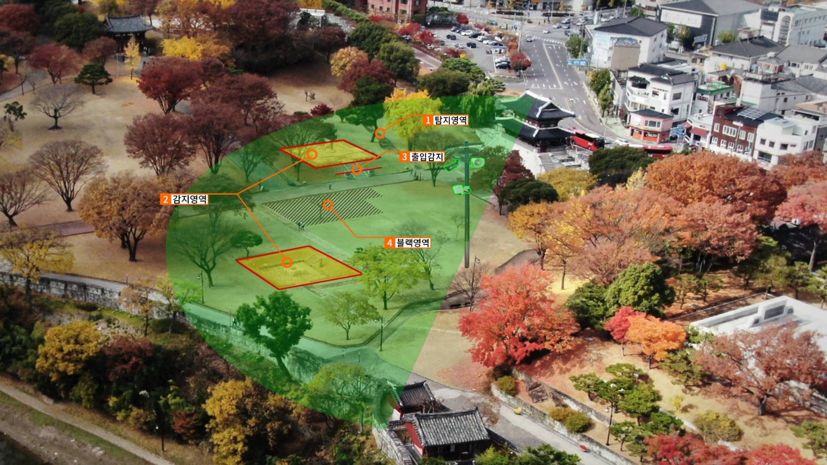 딥러닝을 이용한 영상분석, 지능형 영상분석을 이용한 선별관제, 레이다와 IP스피커를 이용한 침입감지, 열/실화상 카메라를 이용한 화재 탐지