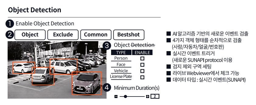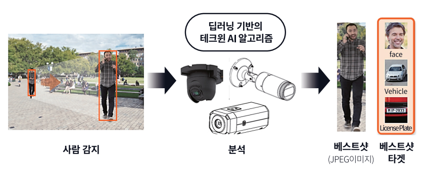 Bestshot 추출 지원 : 사람, 차량, 얼굴, 번호판에 대한 JPEG 이미지를 생성하여 전달함(4K 해상도)